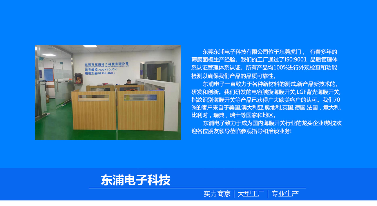 東莞市東浦電子科技有限公司成立于2017年,位于東莞市虎門鎮(zhèn)南柵社區(qū)第六工業(yè)區(qū)工業(yè)園內(nèi),占地1500平米。緊鄰深圳,廣州,香港,距離深圳機(jī)場僅30分鐘車程,距廣州機(jī)場1小時車程,東浦薄膜開關(guān),PCB/FPC薄膜開關(guān),硅膠按鍵開關(guān),背板薄膜開關(guān),醫(yī)療抗菌薄膜開關(guān),醫(yī)療感應(yīng)電極,戶外防水防紫外線薄膜開關(guān),薄膜面板,硅膠按鍵,銘板標(biāo)簽,屏幕貼合,ACF貼合,硬性電路板組裝,柔性電路板組裝,銀漿印刷PET線路組裝,半成品組裝加工以及整機(jī)項目開發(fā)和組裝加工的高科技企業(yè)