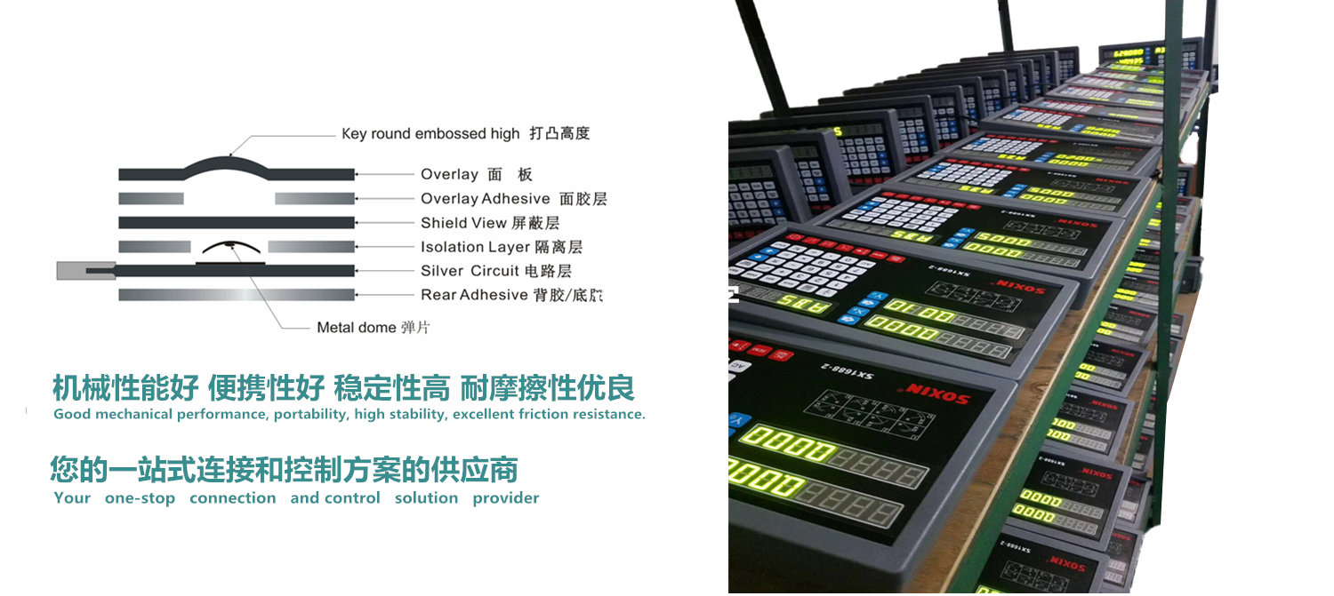 ∧ ∨ 常規(guī)醫(yī)療薄膜開關 東莞東浦薄膜開關是集按鍵功能、指示元件、儀器面板為一體的一個人機界面。主要是由面板、上線電路、隔離層、下電路四部分組成。按下薄膜開關,上電路的觸點向下變形,與下電路的極板接觸導通,手指松開后,上電路觸點反彈回來,電路斷開,回路觸發(fā)一個信號。薄膜開關結構嚴謹,外形美觀,密封性好。具有防潮濕,使用壽命長等特點。廣泛應用于電子通訊、電子測量的儀器,工業(yè)控制,醫(yī)療設備,汽車工業(yè),智能玩具,家用電器等領域